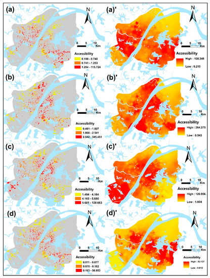 Spatial accessibility to HOPSCA in the main urban area of Wuhan: (a) commerce-oriented HOPSCA, (b) housing-oriented HOPSCA, (c) balanced-development HOPSCA, and (d) business-oriented HOPSCA. Note: To improve the visualization of the spatial distribution of accessibility to HOPSCA (left), we used the interpolation technique to smooth the distribution map (right).