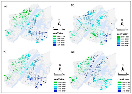 Spatial heterogeneity of price premiums of residential properties generated by HOPSCA: (a) commerce-oriented HOPSCA, (b) housing-oriented HOPSA, (c) balanced-development HOPSCA, and (d) business-oriented HOPSCA.