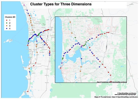 Higher P performance stations (cluster 2) correspond to contra-flow stations, being both trip generators and attractors (many close to the CBD—Claisebrook, East Perth, Glendalough, Maylands, McIver, etc.). Stations in the other clusters, and particularly from cluster 3, exhibit high boarding-to-alighting ratios in the AM peak, making them primarily generator stations (Bull Creek, Cockburn Central, Murdoch, Rockingham, Stirling, Warwick, Whitfords, Edgewater, Greenwood) (Figure 1).