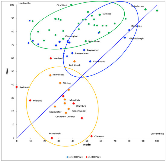 - Node dominant stations may benefit more from densification, if aligned with greater city-wide access to employment opportunities. Many of these stations have a high ratio of train riders for commuting relative to the population, suggesting a higher propensity to use public transport. The importance of transit accessibility at a wider geographical scale (regional) was also confirmed by studies in the USA and Europe [12,33].