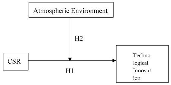 The driving force for technological innovation to address atmospheric pollution includes two main aspects. The first aspect is the mandatory environmental regulation by the government [30]. Scholars who support the “Porter Hypothesis” believe that environmental regulation has a positive effect on increasing enterprises’ technological innovation investment. Enterprises expect to reduce pollution and improve product quality by increasing investment in technological innovation, thereby reducing production costs and increasing operating income [31]. However, some scholars have raised objections and believe that environmental regulation cannot effectively increase the investment in technological innovation [32,33,34]. Thus, the "Porter Hypothesis" is not established under any circumstances [35]. The second aspect is the spontaneous behavior of enterprises, whereby CSR drives the investment in technological innovation of enterprises [36]. By developing high-technology alternatives or improving resource utilization, enterprises can reduce their consumption of natural resources. This reduces emissions while at the same time improving the enterprise’s social reputation and increasing consumer satisfaction [37,38]. Studies have shown that when pollution of the atmosphere rises, the government will tend to strengthen environmental regulation and enterprises will pay more attention to the atmospheric environment for this reason [39]. Furthermore, pollution of the atmosphere will lead consumers to call upon enterprises to strengthen their environmental protection behaviors and strengthen their CSR [40]. Moreover, when the atmospheric environment is poor, the government will introduce strict environmental regulations and policies, and forcefully intervene in the production and environmental protection activities of enterprises by increasing environmental taxes and fines. These kinds of interventions increase the production and operational costs of enterprises [41,42], which weakens the intensity of enterprises’ technological innovation investment [43]. Therefore, this paper proposes the following hypothesis:
