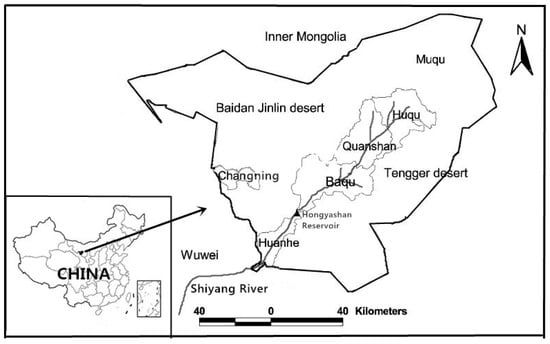 To investigate farmers’ perceptions of water scarcity, a semi-structured survey was conducted in Minqin County, Gansu province of China (see Figure 2). Hills and deserts surround the county and leave an entrance for Shiyang River, the only surface water supply, flowing in from the south. The area is characterized by a typical arid continental climate with low precipitation and extremely high evaporation [29]. The total precipitation was 139 mm in 2011 [67], and the average evaporation was 24 times the average precipitation during 1950–2010 [27]. There are five agricultural production districts and one grazing district: Changning, Huanhe, Baqu, Quanshan, Huqu, and Muqu. Due to sufficient surface water supply in the historical period, it developed into an agricultural production area. The county was referred to as a “barn” for northwestern China decades ago, and it is still called Minqin Oasis. Typical crops include spring wheat, summer maize, cotton, onion, and melons [27]. Rare precipitation in growing seasons encourages local famers to extract groundwater, in addition to relying on an unstable surface water supply. Intensive farm irrigation accounts for more than 90% of fresh water use, and resulted in dried lakes at the lower reaches of the Shiyang River. As a result, local communities put much effort into preventing environmental degradation and promoting the sustainable use of water resources.
