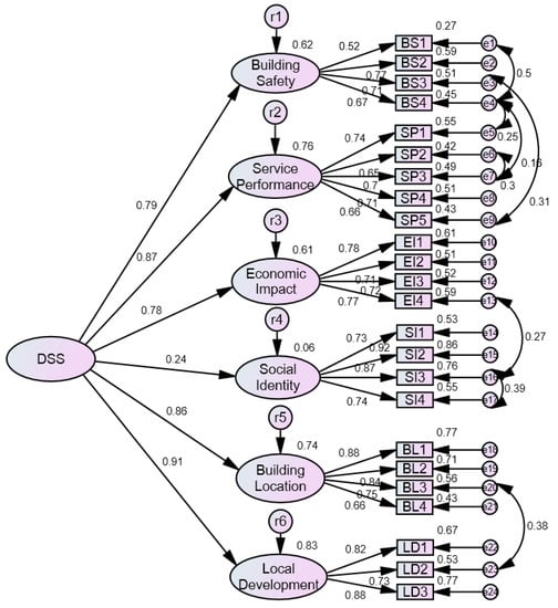 Having assessed the overall fit of the model, its reliability and validity were tested. Reliability relates to the consistency of a set of observed indicators, while validity relates to the underlying cause of the indicators’ covariation [62]. The validity of each path in the CFA model was evaluated using a standardized lambda coefficient, while reliability was evaluated using a squared multiple correlation coefficient (R2) [53]. Both the validity coefficient and R2 value range from 0 to 1. As the validity coefficient approaches 1, the indicator reveals a higher level in representing the construct of interest. Similarly, as the R2 value approaches 1, greater is the variability in each indicator accounted for by the unobserved variable. The lower acceptable limit for the validity coefficient is 0.5. However, there is no consensus on the lower limit for accepting R2 [53,66]. For the observed variables, the t value associated with each loading is significant at the 0.001 level, and all the standardized loadings (standardized lambda coefficients) range from 0.523 to 0.925. This exceeds the minimum threshold. The t value associated with each latent variable corresponding to the higher-order factor is significant at the 0.05 level, and all the standardized loadings are higher than 0.7, with the singular exception of the loading between the DSS and Social Identity, which stands at 0.24. While this loading is evidently low, the latent variable of Social Identity was nevertheless retained as it figures prominently in many substantial previous studies as an indispensable dimension in determining urban renewal policy.