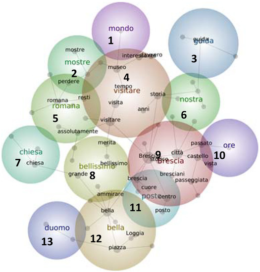 Concept map ‘The city of Brescia and its hinterland’—reviews in Italian—positive ratings. 1. World; 2. Exhibitions, to lose; 3. Guide; 4. Visit, interest, museum, time, history, visit, years; 5. Ancient Roman Art, absolutely; 6. Our; 7. Church; 8. Beautiful, attention, great; 9. Brescia, city, past, castle, panoramic, walk; 10. Hours; 11 Heart, Downtown, place; 12. Beautiful, enjoy, “Loggia”, square; and 13. Cathedral.