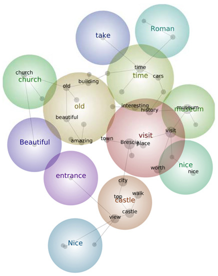 The main topic is Brescia, followed by the term ‘to visit’ (Figure 1). The words related to the topic Brescia are: city, downtown, historical, castle, past, walk, visit, Brescia-related elements (in Italian: bresciani). The city is, therefore, considered by the Italian reviewers as a catalyst and a container of cultural elements. The city of Brescia features some elements such as the Cathedral, the Loggia square and the Santa Giulia museum that appear to be ‘driven’ by the visibility of the city.