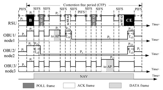 In the 802.11p standard, an OBU must respond within a short interframe space (SIFS)  period once it receives a polling frame from the Hybrid Coordinator (HC) in the CFP duration. When the OBU or sensor node does not have any queued packet to send, it will send back a null frame, which is a waste of channel resources and energy consumption. Obviously, continuous interception and polling from the RSU in a completely empty network would be a serious energy waste. On the other hand, idle listening and null frame transmission from OBUs or sensor nodes would take up a large amount of channel resources.