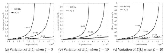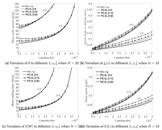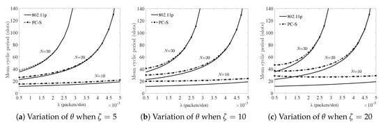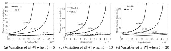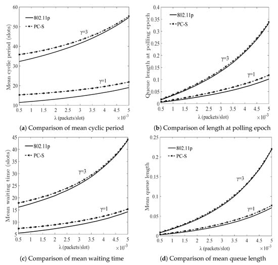 In Figure 4, the variation of , , , and  are compared, respectively. It became obvious with the increased traffic load, which clearly showed that the performance of the two systems was degraded and also tended to agree with each other when the load was heavy. Additionally, as shown in Figure 4, the increased switch-over time could result in worse performance, which indicates an unsuitable wireless channel or some distance among the AP and nodes. However, under the stability conditions,  was only 1 or 2 slots longer than that of 802.11p when  was 5 slots, which means that the QoS could be guaranteed in the PC-S system even if nodes and AP implemented a sleeping strategy when there was no request from the nodes. The reasons are follows: