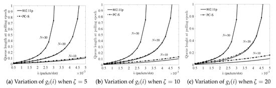 When , it means the system is oversaturated and ineffective. As a result, the data packets piled up in the nodes will increase in number and the RSU will not be able to transmit them on time> This means that the mean cyclic period, the average waiting time, and the queue length will become enormously high, as shown clearly in Figure 4, Figure 5, Figure 6, Figure 7, Figure 8 and Figure 9.
