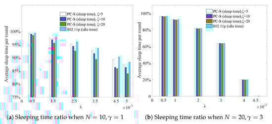 As shown in Figure 10, the average sleep time of a node in PC-S and the idle time of a node in 802.11p both declined with increasing load. However, when the load was not very heavy, the idle nodes in 802.11p took more than  of the time to overhear during the vacation without data transmission. The nodes in PC-S can turn the radio transceivers to sleep in order to reduce the energy consumption. As can be seen in Figure 10b, with increasing  and N, even if the load almost reached the extreme working condition, the sleep rate for PC-S was still about .