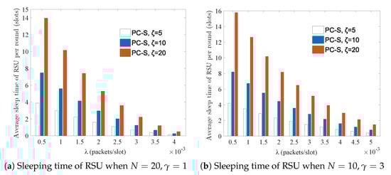 In Figure 11, it is observed that with increasing sleeping factor under the same conditions, the sleeping time of the RSU became longer but it was shorter than . This is because there were always a few nodes requesting data transmission, and so as long as the traffic load is not zero, the RSU must keep active. Furthermore, increases in the arrival rate and the network scale led to decreases in the RSU’s sleeping time, and finally it dropped down to 0. Especially, when the throughput was more than  (i.e., when the system became busy), the RSU’s sleeping time reduced rapidly—even less than 2 slots. Therefore, the RSU can choose to close its sleeping option in order to respond to the nodes quickly. However, this does not mean those idle nodes would remain active, and they can still choose sleeping mode.
