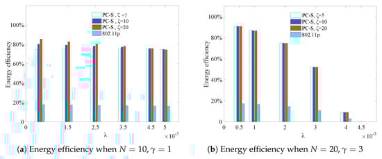 In Figure 12, the energy efficiency of a node under different arrival rates and sleeping factors is compared. The variations of energy efficiency when system load was not very high () is given in Figure 12a. The variations when load was relatively high () are given in Figure 12b. Thanks to employing the sleeping mechanism, the node in PC-S can save a great deal of energy when it is idle and turns to sleeping mode. However, the node in 802.11p just switches to the idle state from overhearing, which led to only less than  energy savings, even when the load was light.