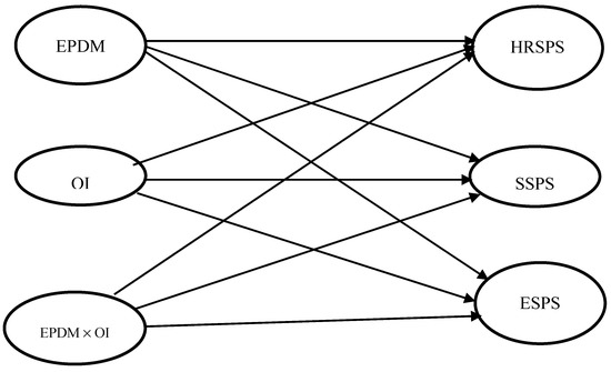 Structure regression model in AMOS for hypotheses testing. Notes: EPDM × OI is the product term of the interaction between these variables. For greater simplicity and clarity, we do not show covariances among independent variables, the item-level structure of the constructs, or error terms of dependent variables.