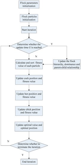 - Start iteration. Determine whether the update time G is reached. If the update time is reached, the flock hierarchy, dominance relationship and parent-child relationship are updated; if the update time is not reached, the positions of the cocks, hens and chicks are calculated according to Equations (9), (12) and (13). The fitness value of each particle is calculated.