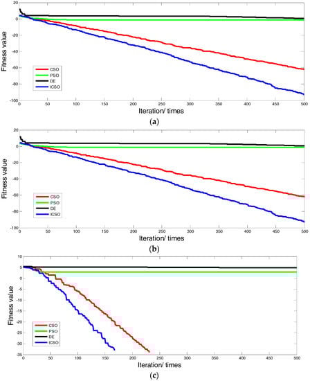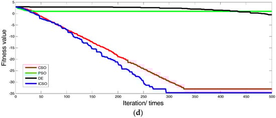 It can be seen from Table 2 that the number of population N is 10 × d (d is the test dimension). M is the number of iterations for the four algorithms, which is 500 in this study. The PSO algorithm has the inertia weight w of 100 and the acceleration factor c1 of 1.5. The scale factor K and crossover factor C of the differential evolution algorithm (DE) are 0.5 and 0.9, respectively. The basic parameters of the CSO and ICSO algorithms are consistent.
