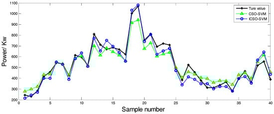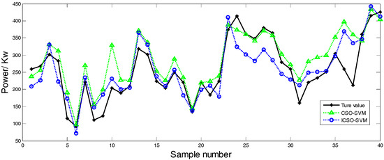 Secondly, ICSO-SVM model and CSO-SVM model are tested with the second set of wind power data. The predicted results of the two models are shown in Figure 6.