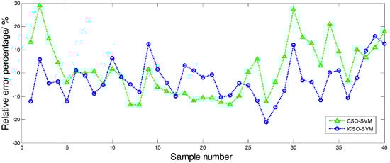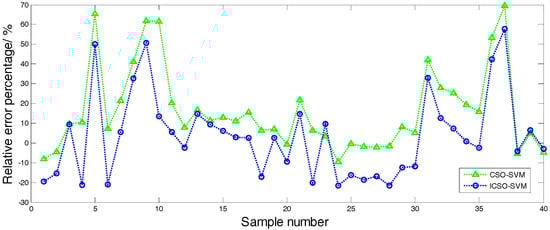 As shown in Figure 4, the black line indicates the true value curve, the green line indicates the predicted curve of the CSO-SVM model, and the blue line indicates the predicted curve of the ICSO-SVM model. On the whole, the fluctuation trend of the blue line is closer to the fluctuation trend of the black line, especially between the 30th sample and the 40th sample. In particular in the later stage of prediction, the trend of blue line is more in line with the trend of black line than that of green line. The relative error percentage curves of the two models are shown in Figure 5.
