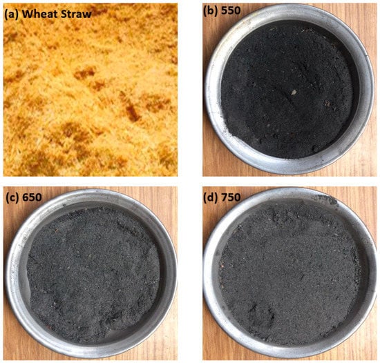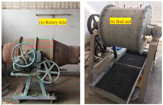 In addition to cement, WSA was used in this study as a partial substitute of cement. It was obtained after burning the local wheat straw at different temperatures of 550, 650, and 750 °C in a rotary kiln for 5 h followed by grinding in a ball mill (Figure 1a,b). The wheat straw is a byproduct of wheat crop, which contains a high amount of SiO2 when burnt to ashes. Before burning, it was thoroughly washed to remove any dust or impurities followed by drying in the open air. The purpose of burning wheat straw at different temperatures was to find out the optimum temperature at which its ashes possess the highest amount of SiO2 and an amorphous structure.