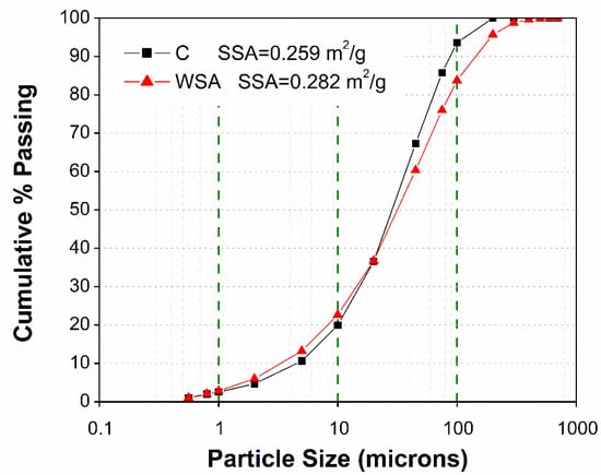 The particle size analysis of grounded WSA was carried out by using the MicroBrook 2000LD laser particle size analyzer. Figure 3 shows the particle size distribution of cement and WSA used in this study. Based on the comparison, it can be seen that WSA contains a higher percentage of smaller particles (finer than 20-micron) as compared to cement. While, on the other hand, the percentage of relatively coarser particles (larger than 20-microns) were high in WSA. The values of SSA of cement and WSA, as calculated using MicroBrook, were estimated as 0.259 and 0.282 m2/g, respectively. Based on a comparison, it is clear that the SSA of WSA is slightly higher than cement. This might be attributed to the presence of higher percentage of finer particles in WSA as compared to cement. Moreover, the d10, d50, and d90 sizes were also calculated for both cement and WSA and listed in Table 2.
