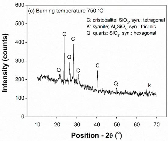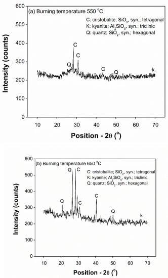 XRD and EDX analyses were performed on WSA samples to investigate the influence of different burning temperatures (550 °C, 650 °C, and 750 °C) on amorphous silica and their chemical composition, respectively. The chemical composition obtained from EDX analysis of different samples of WSA with respect to (w.r.t.) their burning temperatures is listed in Table 6. From this table, it can be seen that the amount of silica content in WSA rose with an increasing burning temperature from 550 to 750 °C. Moreover, the percentage sum of major oxides (SiO2 + Al2O3 + Fe2O3) also increased with increasing temperature as 49.19%, 53.52%, and 59.45% at 550 °C, 650 °C, and 750 °C, respectively.