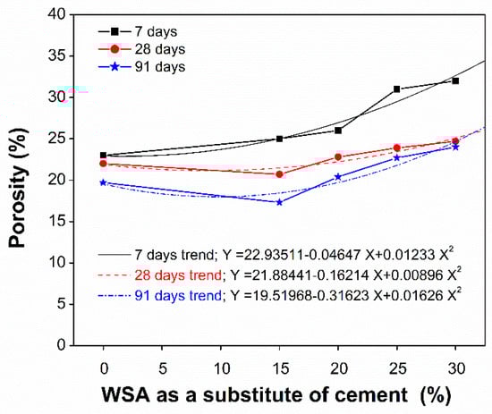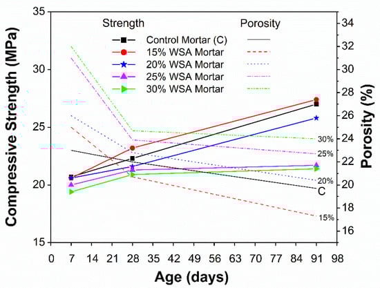 Lastly, these average results of porosity and compressive strength were plotted against aging to compare between different mortars containing WSA and control mortar. Figure 5 and Figure 6 show the comparison of compressive strength results and porosity, respectively. From Figure 5, it can be seen that the early-age compressive strength of mortars containing 15% and 20% WSA got reasonably close to that of control mortar and increased continuously with aging for mortar with 15% WSA. At ages of 28 and 91 days, the strength enhancement in 15% WSA mortars was noticed as 3% and 4% higher than that of the control mortar, respectively. This was also confirmed by the porosity tests (Figure 6) corresponding to the age of 28 and 91 days where it can be clearly seen that the respective porosity values of 15% WSA mortar were lower than the control mortar. In general, the current results indicated that the porosity of mortar decreased with aging for all mortar mixes, which is clear due to the consumption of water by the hydration reaction and the generation of a solid gel in the matrix. Unlike 15% WSA mortar, gaining good early-age strength developments in mortar with 20% WSA was discontinued at later ages of 28 and 91 days and the final strength values were lower than the control mortar (Figure 5). This trend of lower strength in 20% WSA mortar was also validated through the porosity results where it was slightly higher than the control sample, which might be due to a reduced hydration/pozzolanic reaction in the presence of lower amounts of cement as compared to mortar of 15% WSA.
