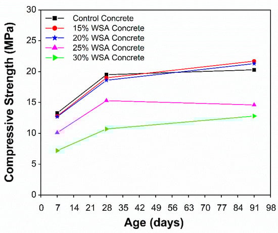 Just like mortars, the compressive strength of concrete containing 15% and 20% WSA was slightly less than the control concrete at ages of 7 and 28 days. At an age of 91 days, it increased by 6% and 4% when compared to the control sample in concrete containing 15% and 20% WSA, respectively. The compressive strength in concrete containing higher percentages of WSA such as 25% and 30% was reduced drastically as compared to control concrete at all ages. However, as discussed in the preceding section, the SAI values of mortars of more than 75% still suggested that the higher percentages of WSA such as 25% or 30% can be used to produce sustainable concrete. For instance, this includes projects where high early or ultimate strength of concrete are not required.