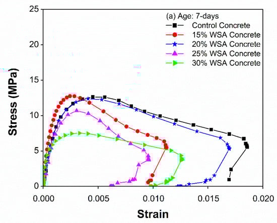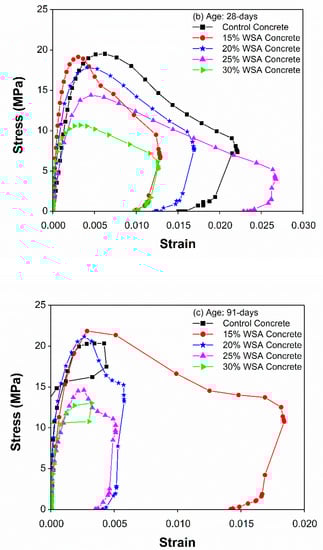 In addition to the simple comparison of compressive strengths, this study has further investigated the influence of WSA on general stress-strain behavior of concrete. Figure 8 shows the comparison of the stress-stain relation with aging between control concrete and concrete containing different percentages of WSA. It can be seen that the general trend of stiffness and toughness of concrete reduced with an increasing percentage of WSA. However, at relatively low percentage replacements, the stiffness was significantly enhanced at all ages such as for concrete containing 15% and 20% WSA. Along with stiffness, their toughness seemed comparable to control concrete. Particularly, the ductility and toughness of concrete containing 15% WSA was significantly higher than the control concrete at age of 91 days followed by the concrete containing 20% WSA.