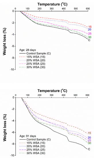 The utilization of Ca(OH)2 is being used as an indirect assessment of pozzolanic reactivity in the cement pozzolan pastes [54,55,56]. It is well known that the amorphous silica present in the pozzolana reacts with portlandite (Ca(OH)2) as produced during a normal hydration reaction and form C-S-H. The comparison of TGA analysis curves showed maximum weight loss occurred in control samples between 430 and 460 °C irrespective of the curing age (28 or 91 days). The initial steep slopes observed can be attributed to a loss of chemically bound water related to AFm, AFt, or C-S-H phase as well as free moisture present in the samples. As compared to the control samples, weight loss within this temperature range reduced in pastes containing WSA irrespective of the percentage substitution. The least weight loss was observed in paste containing 15% WSA, which indicates its greatest pozzolanic reactivity as compared to other samples. Moreover, this weight loss increased with an increasing percentage of WSA from 15% to 30%. Though insignificant, relatively lesser weight loss in pastes containing WSA as 20%, 25%, and 30% suggested minor pozzolanic reactivity at 28 days.
