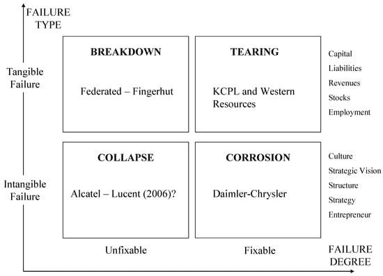 An example of tangible failure in mergers is the merger case of Federated and Fingerhut. Federated paid about 30 per cent premium price in the deal and sold the operation for less than US$ 800 million in 2002, after purchasing the firm for US$ 1.7 billion in 1999 []. This unsuccessful and unsustainable merger case is unfixable and originated by tangible failure. In our failure analysis, this combination of tangible and unfixable failure merger is called “Breakdown”.