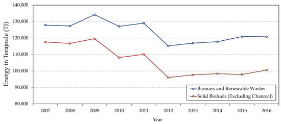 As a result, one of the solutions to reduce Portugal’s energy dependence from the exterior is to replace the use of fossil fuels, one of the most promising alternatives being biomass, which includes forest, agricultural residues, and all biodegradable organic waste originating from man and animals. This energy source is very flexible and can be used in its pure form or processed to produce biofuels. According to Eurostat [20,21], the energy produced from biomass and solid biofuels sources in Portugal in the last 10 years shows a significant decline in consumption between the years 2009 and 2012, as can be seen in Figure 1. This decrease is due mainly to the exportation of biomass products, mainly in the form of wood pellets, to northern Europe, instead of national use due to the higher prices paid by such countries.
