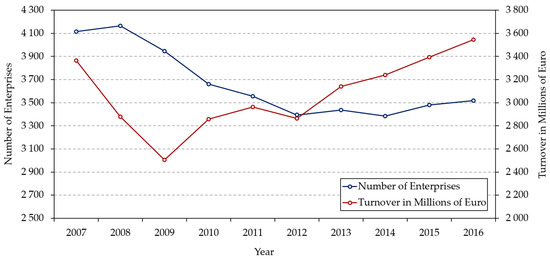 - Eurostat—Data Explorer. Available online: http://appsso.eurostat.ec.europa.eu/nui/show.do?dataset=sbs_na_ind_r2&lang=en (accessed on 8 October 2018).
