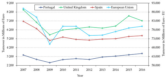 The turnover of the textile industry in EU, Portugal, United Kingdom and Spain.