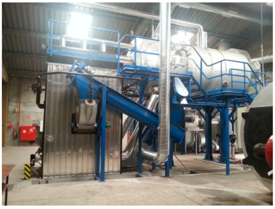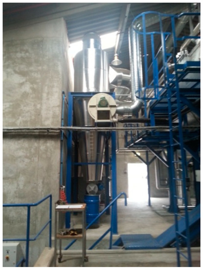 A modern biomass boiler (for pellets, chips, wood briquettes and wood residues) represents an ecological and convenient solution, alternatively or by integration, of traditional heating systems for fossil fuels. The transition from fossil fuels to biomass also means altering and upgrading the equipment, as can be observed in Figure 7, where the first steam boiler in a textile dyeing industry was assembled. This can frequently be very challenging to accomplish due to logistical and spatial order obstacles. This happens mainly due to the fact that these units have been operating unaltered for decades and are occupying obsolete facilities. These installations have been established to satisfy the production needs of that period. Thus, in facilities adapted for biomass, they must have space for storage and for the filter system, as can be observed in Figure 8 and Figure 9, respectively.