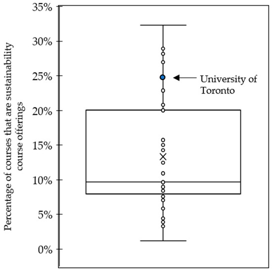 Percentage of undergraduate sustainability course offerings at Canadian higher education institutions (HEIs) with data from the Advancement of Sustainability in Higher Education Sustainability Tracking, Assessment, and Rating System (AASHE STARS) [59]. Courses that include sustainability encompass both “sustainability courses” and “courses that include sustainability” in the STARS framework. The cross represents the mean of the data; the blue dot indicates the U of T Sustainability Course Inventory (SCI).