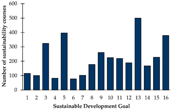 The Sustainable Development Goals were designed as a framework to identify and cluster sustainability courses because of their international adoption, expert formulation, and comprehensiveness on the topic of sustainability [52] (Le Blanc argues that the SDGs have better integration across sectors than their predecessors, the MDGs. This integration is understood as improved comprehensiveness of the interconnected challenges in sustainability.) The SDGs consist of a set of 17 goals, 169 targets, and 243 indicators that UN member states designed and adopted to use as a framework for development policy until 2030 [53]. They are an extension of the Millennium Development Goals (MDGs) and were adopted by world leaders in 2015 as a part of the 2030 Agenda for Sustainable Development [51]. These goals are not legally binding, therefore governments are expected to design their own process for implementation of policy to further these goals [54]. Goal 17, “Strengthen the means of implementation and revitalize the goal partnership for sustainable development,” was excluded from our methodology, as it encompasses the act of achieving the other goals rather than bringing a new perspective to sustainability, making it poorly-fitting for this purpose.