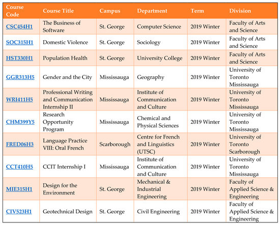 - University of Toronto Course Finder. Available online: http://coursefinder.utoronto.ca (accessed on 18 January 2019).