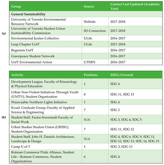 Condensed sample pages of the U of T (a) Co-Curricular and (b) Extracurricular Sustainability Inventory. Student contacts have been omitted for privacy.