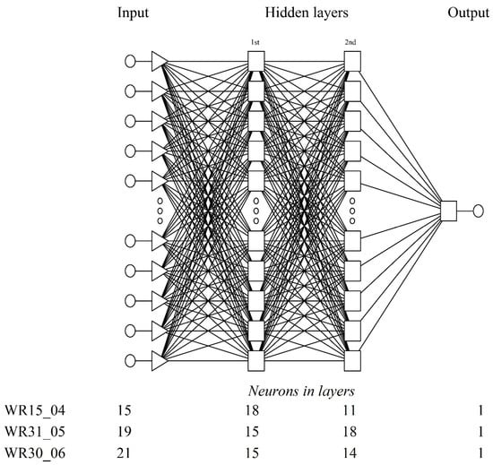 As a result of the analyses, one neural model was selected for each prediction date. Basic information on the quality of the neural models, WR15_04, WR31_05, and WR30_06, is given in Table 3. The general structure of the designed neural network model is presented in Figure 2.