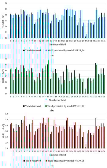 Figure 3 shows a comparison of yield results for all models produced with the observed yield. As it is easy to notice, fields no. 29 and 33 definitely differ from the average value of the observed yield, which amounted to 3.81 t∙ha−1. For field no. 29, the observed yield was 2.14 t∙ha−1, and 4.63 t∙ha−1 for field no. 33. The average value of the forecast yield for models WR15_04, WR31_05, and WR30_06 amounted to 3.92 t∙ha−1, 3.58 t∙ha−1, and 3.87 t∙ha−1 respectively.