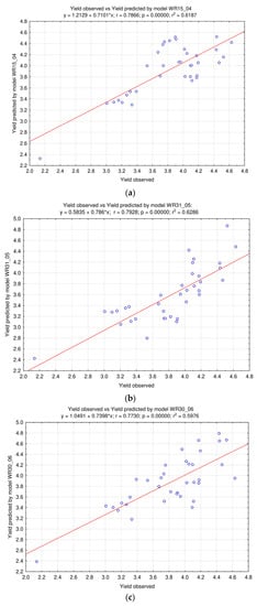 As shown in Figure 4, model WR31_05 has the best match between the real yield and the forecasted yield, for which the determination coefficient of R2 was 0.6286. The other models slightly deviate from this result. In model WR15_04, the determination coefficient, R2, of 0.6187 was achieved, while in model WR30_06, the determination coefficient, R2, of 0.5976 was obtained.