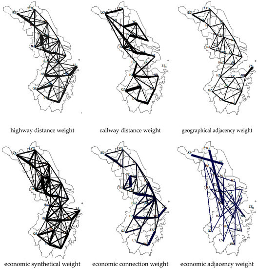 We set six different weight matrices, namely, the geographic distance (of highway and railway) weight matrix, the geographical adjacency matrix, the economic distance (of GDP and economic linkage) matrices, and the economic adjacency matrix, to depict the housing spatial correlation in the Yangtze River Delta Urban Agglomeration. Among these matrices, the highway distance weight matrix takes the reciprocal square of the highway distance between cities as element, the railway distance weight matrix takes the reciprocal square of the railway distance between cities as element, the geographical adjacency weight matrix takes the element of one when cities are adjacent to each other and zero when cities are not adjacent under the Queen rule, the economic distance weight matrix takes the GDP difference quotient and the geographical distance between cities as element, the economic connection weight matrix takes the economic linkage degree between cities as element which is calculated by Rij as previously, and the economic adjacency weight matrix takes the element of one when cities are closest to each other in per capita GDP and zero when they are not. The results of the six weight matrices are illustrated in Figure 1, wherein the thickness of lines represents the degree of spatial link between cities.