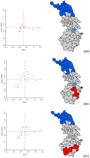The Moran’s I scatter plots indicate the same distribution since 2006. The last line in Figure 2 shows that 16 cities are located in Quadrants I and III in 2012, accompanied by strong spatial autocorrelation. In the LISA map, the cold spot is still grouped in North Jiangsu, and Jiaxing in North Zhejiang still as an outlier in the region, while Lishui and TaizhouZ in South Zhejiang as the new hot spots,