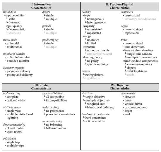 Based on the VRP taxonomy of Eksioglu et al. [27] and our literature review in Section 3, we derived the following scheme to classify relevant real-world VRP-attributes (Figure 1). We reduced the complexity of the VRP taxonomy presented by Eksioglu et al. [27] because not all categories are appropriate for the developed MAVRDSS. For instance, we do not distinguish between different solution methods as we focus on a heuristic approach. This complexity reduction is also suggested by Lahyani et al. [6], who assess existing taxonomies as too ambiguous due to its high level of detail. The goal is not to stress the particularities and differences between all VRP variants but rather to list all relevant model attributes that constitute a specific VRP variant, while keeping a moderate level of granularity.