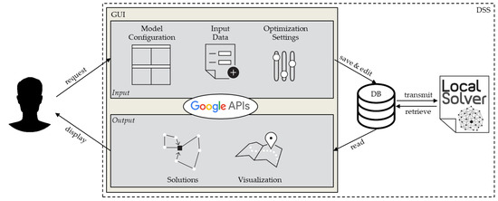 MAVRDSS is built as prototype web-application to run the computationally intensive optimization on a remote server, while a MAVRDSS-user only needs to operate a device supporting a web-browser. All user actions are executed via the graphical user interface (GUI). The software comprises five main components as depicted in Figure 2: Model configuration, input data, optimization settings, solutions, and visualization. The model configuration represents the customizable part of the routing model based on the attributes in the classification scheme. With the manifold configuration opportunities shown in Figure 1, diverse urban logistic applications can be simulated, considering the industries’ specific constraints. Within the whole configuration process, the user is served with descriptive information about the model attributes. The input data refers to the customers, depots, vehicles, and their associations. A user creates customers, depots, etc., and associates parameter values by filling out input forms. Optimization settings refer to user-sided configurations of the optimization process, which can be set before an optimization run (e.g., running time limit). MAVRDSS provides an interface-to-database system that allows writing and reading relevant data. A step counter variable keeps track of the configuration status. After saving the model configuration, input data, and optimization settings in the database (DB), the user can start an optimization run. All information is transformed into a case-specific optimization model and passed to the software LocalSolver for resolution. LocalSolver is a mathematical programming solver based on local search techniques following the model-and-run paradigm that offers the possibility to tackle a large class of different problems. In this way, the complex processes of defining neighborhoods, moves, and the search strategy are automated. After an optimization run, the solutions (e.g., customer sequencing) are saved in the DB. The user can access and visualize them via the GUI, using Google APIs (application programming interface) for appropriate presentation in an embedded map. A user interacts with these described components when operating the web-application (see Figure 2).