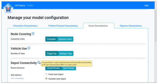 As the routing model’s versatility and customizability are the fundamental features of MAVRDSS, its utilization must be supported through an adequate design and functionality of the web-application. In this regard, the main requirement is the applicability of MAVRDSS by end-users with neither programming skills nor knowledge of optimization methods. While the development of a user-friendly interface with meaningful help systems is a long-winded process, this article offers a prototype-tool for the multi-attribute VRP. Information buttons with hover effect provide a brief description of each attribute to further support the user. For instance, Figure 3 illustrates an extract of the web-application’s GUI during the model configuration.