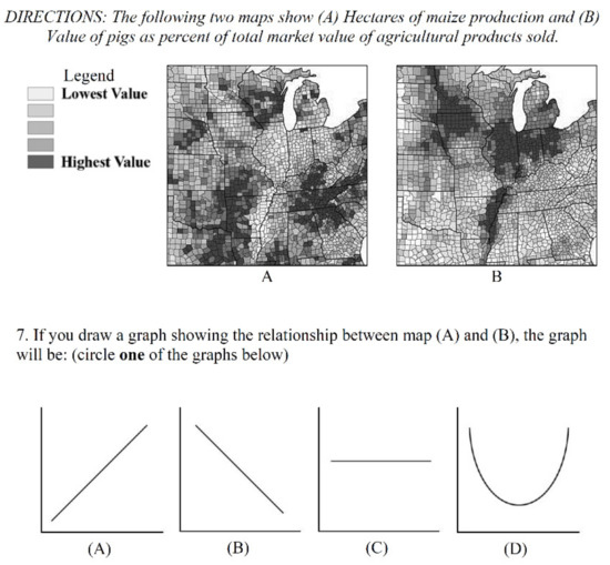 | V (#6, #7) | Identify and graph the spatial correlations between sets of maps | Comprehending and graphing the positive and negative spatial associations on two maps | Recognizing and reasoning the spatial relations between sets of maps, including associating, correlating, estimating and then graphing spatially the distributed phenomena |