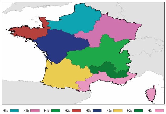 As can be seen, the limitations of the thermophysical properties of the envelope depend on the climate zone of the building. The climate classification is regulated in the decree Arrêté du 26 octobre 2010 [37]. In this decree, climate is divided into three zones for winter (H1, H2, and H3) and four for summer (a, b, c, and d). A total of eight different climate zones are obtained from the combinations (see Figure 1).