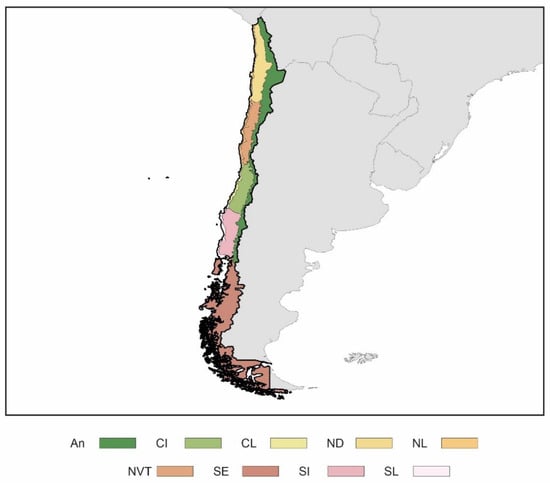 Chile was one of the first South American countries with a wide development on energy efficiency of buildings. The climate zone of Chile was approved in 1976 through the standard NCh 1079 [44]. This standard, reviewed in 2008, establishes the climate classification in nine different zones (see Figure 4). These climates have notable differences between them. The topography of Chile significantly influences the climate characteristics of the various regions (rainfalls, temperatures, solar radiation, etc.), as many research studies reflect [45,46,47,48]. Therefore, there are different microclimates as the altitude oscillates between 0–6000 mamsl [49]. Regarding the climate classification, distinctions are not made according to the climate severities of winter and summer (as in other countries) but according to the bioclimatic characteristics of each region. For this reason, the nomenclature of zones varies: An (the Andean and the upper pre-Andean border in the Chilean highlands), CI (the central valley between the NL zone and the pre-Andea of Andes), CL (coastal zone from Mount Aconcagua to the Bío-Bío valley), ND (region between the Costa and the Los Andes mountain ranges), NL (coastal zone between the border with Perú and the northern limit of La Ligua), NVT (northern region between the coastal zone and the Los Andes valley and between Pueblo Hundido and the valley of Aconcagua river), SE (region in the south from Chiloé to Tierra del Fuego), SI (region in the south from Bío-Bío to the Reloncaví inlet), and SL (coastal zone from Bío-Bío to Chiloé and Puerto Montt).