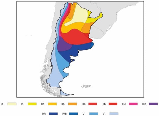 Together with Chile, Argentina was one of the first South American countries with a regulatory development on energy efficiency of buildings. In this regard, one of the first standards marking the energy beginnings of the country was the standard IRAM 11603 in 1981 [50]. This standard made a bioclimatic classification of the country in six different zones (see Figure 5). The classification was made by naming zone I as the hottest zone and zone VI as the coldest. In a review conducted in 2012, a total of four subcategories were distinguished in zones I–IV according to the bioclimatic characteristics of each zone: a (zones with thermal amplitudes greater than 14 °C), b (zones with thermal amplitudes lower than 14 °C), c (zones of transition from zones with greater thermal amplitudes to others with lower thermal ranges), and d (coastal zones with low amplitudes throughout the year). In addition, the IRAM 11603 provides general guidelines related to the design of the envelope as well as the evaluation of favorable orientations and the compliance of minimum sunlight in buildings for dwelling purposes.