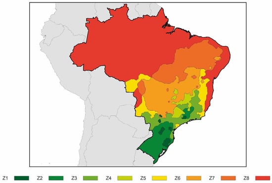 In Brazil, the first regulatory development on the energy efficiency of buildings took place in 2005 through the NBR 15220 [54], in which the technical characteristics of social housing were established. These characteristics were assigned differently in the country through a climate classification in eight various zones (see Figure 6). Later, in 2008 and in the version reviewed in 2013, the standard NBR 15575 [55] established the thermal characteristics that buildings should have. In particular, limitations are established in the thermophysical properties of walls and roofs, distinguishing different limit values according to the climate zone (see Table 10).