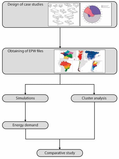 The flowchart of the research procedure consisted of designing a set of building models and their evaluation of the useful energy demand obtained according to the thermal requirements of the envelope in each climatic zone (see Figure 7). For this purpose, models were simulated in the different climatic zones, and their envelopes were configured according to each regulation. Finally, a cluster analysis was carried out to assess the similarity between the climatic zones.